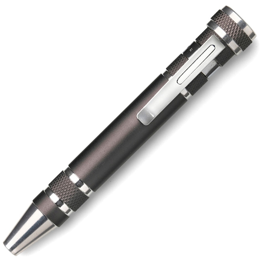 Kynän muotoinen ruuvimeisseli jossa kahdeksan liittyvää kärkeä.