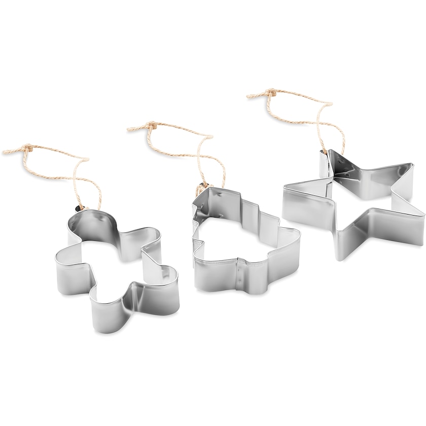 Kolmen piparkakkumuotin setti. Muoteissa on ripustusnarut, joten niitä voi käyttää myös joulukoristeina. Tuotteet toimitetaan valkoisessa lahjalaatikossa. Painatus tehdään laatikkoon.