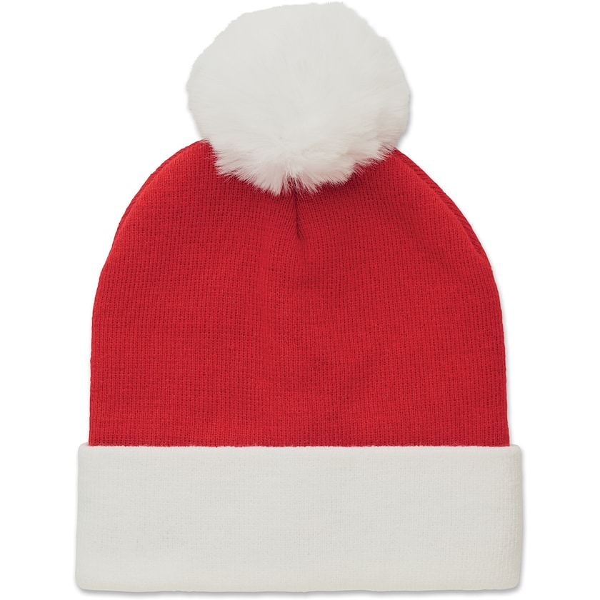Neulottu tonttulakki isolla tupsulla. Merkintä tehdään brodeerauksella. Tulkoon joulu!