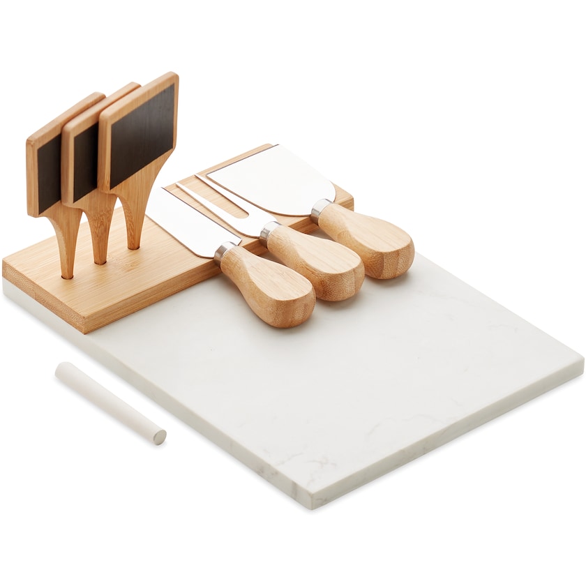Marmorinen juustotarjotinsetti bambupuisilla yksityiskohdilla. Ylellinen lahja kaikille juuston ystäville. Mukana veitset sekä kolme kylttiä, joihin voi kirjoittaa tarjottavien juustojen nimet. Mukana yksi liitu. Tuotteet toimitetaan lahjalaatikossa. Laserkaiverrus tehdään laudan bambuosaan.