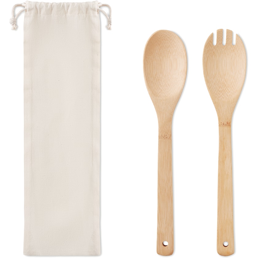 Salaattiottimet bambusta. Toimitetaan luonnonvaaleassa pussissa. Painatus tehdään pussiin ja laserkaiverrus yhteen ottimista. Luonnonmateriaalin vuoksi salaattiottimien väri voi vaihdella.