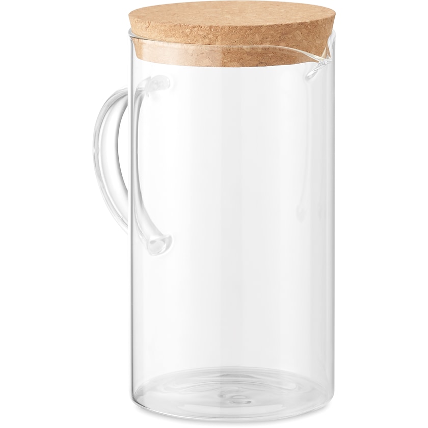 Kannellinen lasikannu. Kannu on tehty borosilikaattilasista ja se sopii niin kylmille kuin kuumille juomille. Laserkaiverrus tehdään korkkiin. Painatus maksimissaan yhdellä värillä.