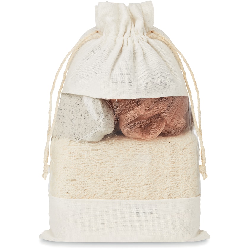 Pesusieni, jalkaraspi ja pesukukka säilytyspussissa. Painatus tehdään pussiin.