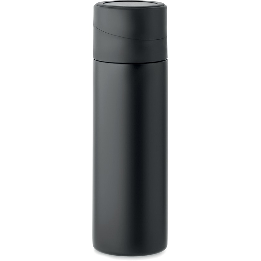 Ainutlaatuinen termospullo, jossa on puhelinpidike kannessa. Termoksessa on kaksinkertaiset tyhjiöeristetyt seinämät ja se on valmistettu 90 % kierrätetystä ruostumattomasta teräksestä ja 10 % ruostumattomasta teräksestä. Kannessa on silikonirengas, joka pitää kännykän paikallaan, kun se asetetaan kannen päälle.