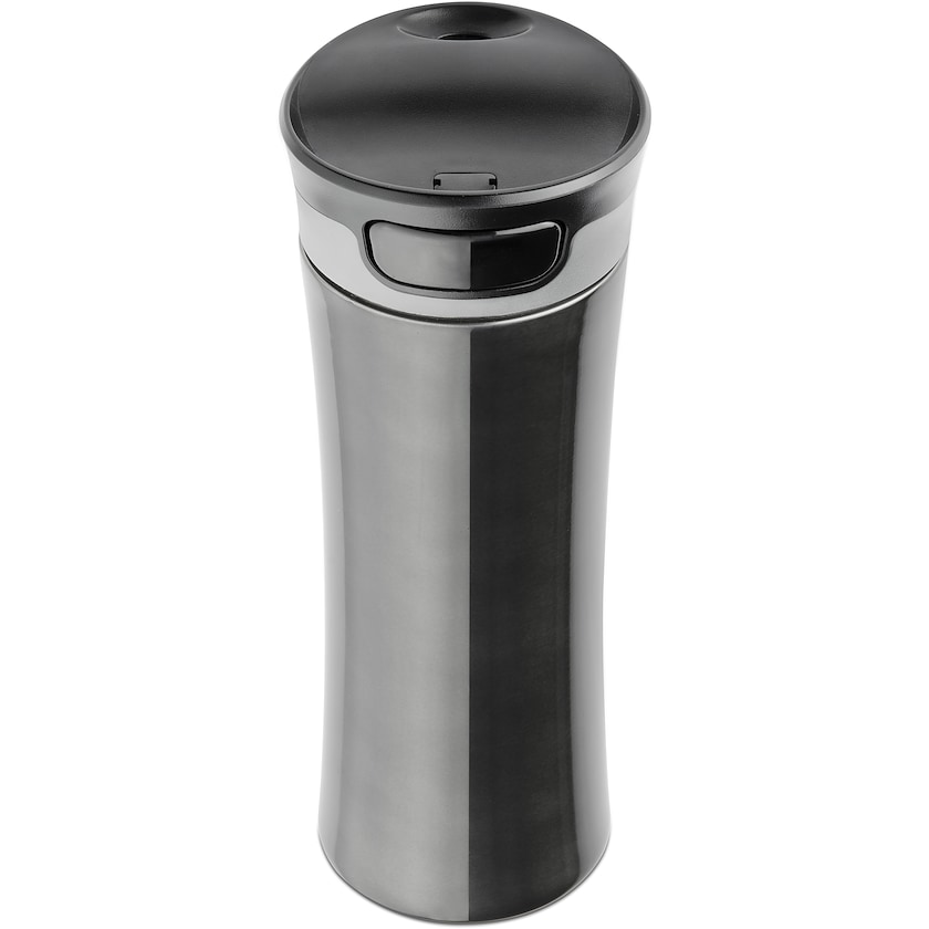 40 cl termosmuki modernilla designilla. Säilyttää juoman lämpötilan jopa 10 tuntia. Kansi aukeaa nappia painamalla. Painatus vain laserkaiverruksena.