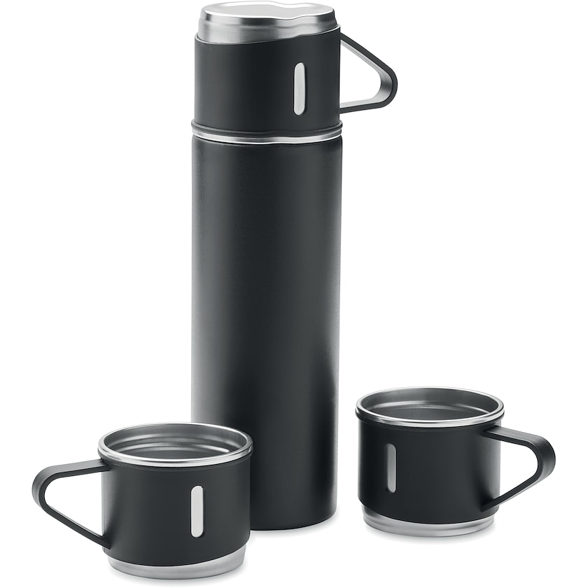 Ruostumattomasta teräksestä valmistettu termospullo, jossa on yhteensä kolme kuppia. Termospulloon mahtuu 42 cl ja kuppeihin 15 cl. Vesitiivis.