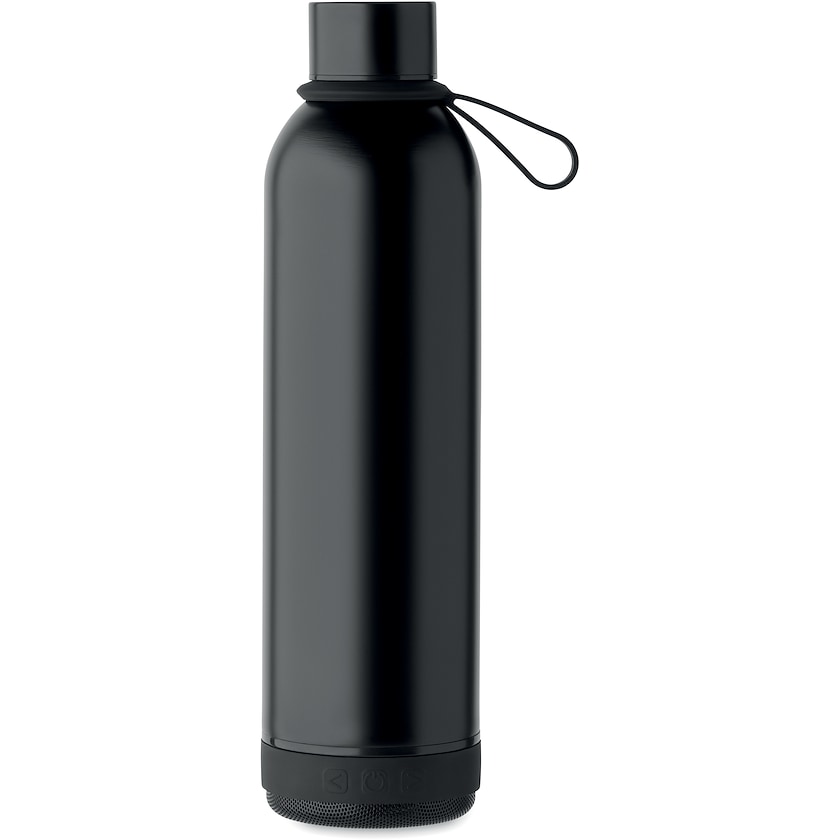 Termos irrotettavalla langattomalla kaiuttimella. Termoksessa on kaksinkertaiset tyhjiöeristetyt seinät ja se on valmistettu 90 % kierrätetystä ruostumattomasta teräksestä ja 10 % ruostumattomasta teräksestä. Vesitiivis. Kaiutin on poistettava puhdistusta varten.