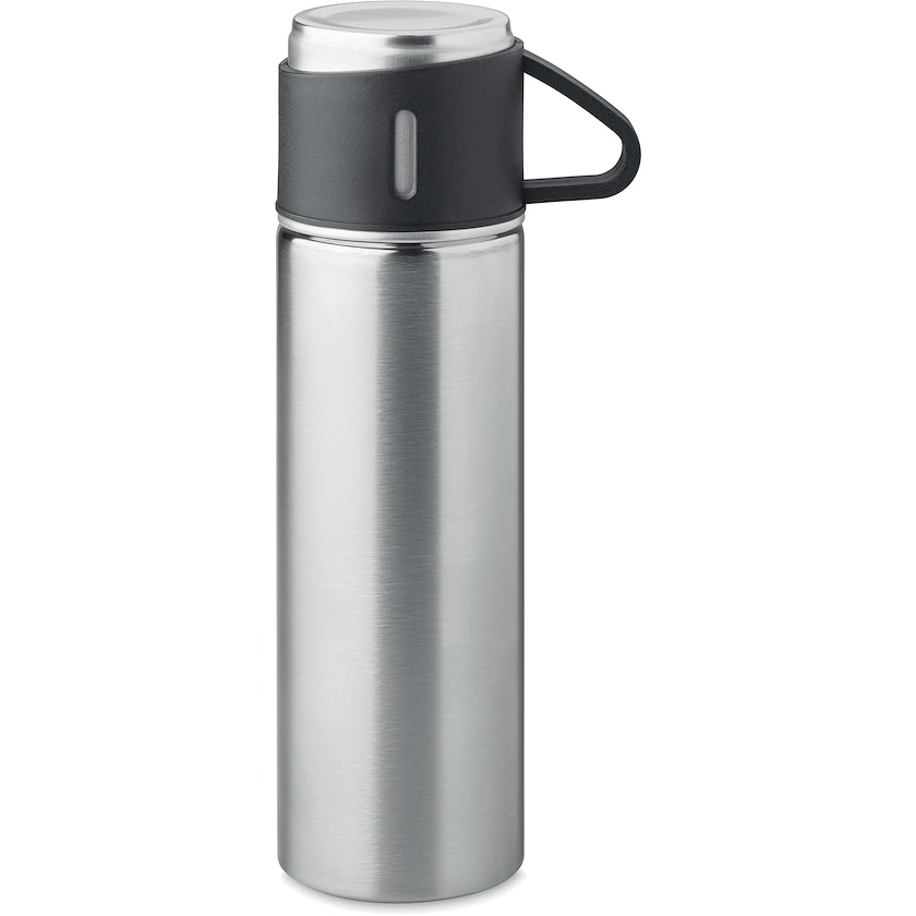 Ruostumattomasta teräksestä valmistettu kahvallinen termospullo, jossa myös kuppi. Termospulloon mahtuu 42 cl ja kuppiin 15 cl. Vesitiivis.