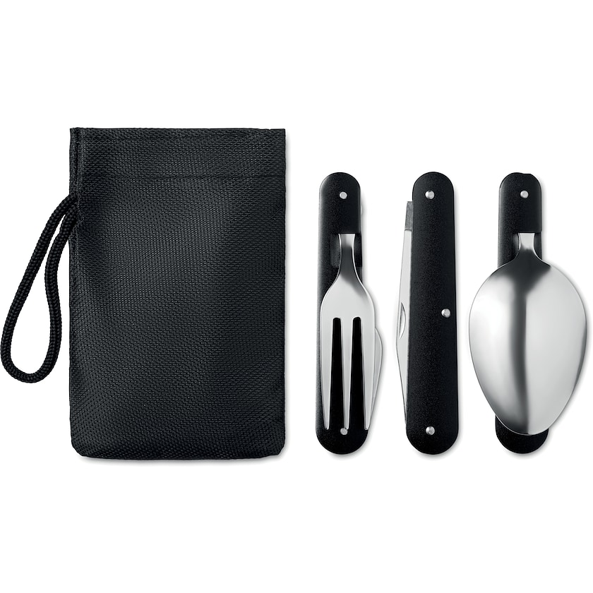 Retkiaterimet ruostumattomasta teräksestä. Setti sisältää taitettavan lusikan, haarukan ja veitsen. Painatus tehdään mustaan säilytyspussiin.