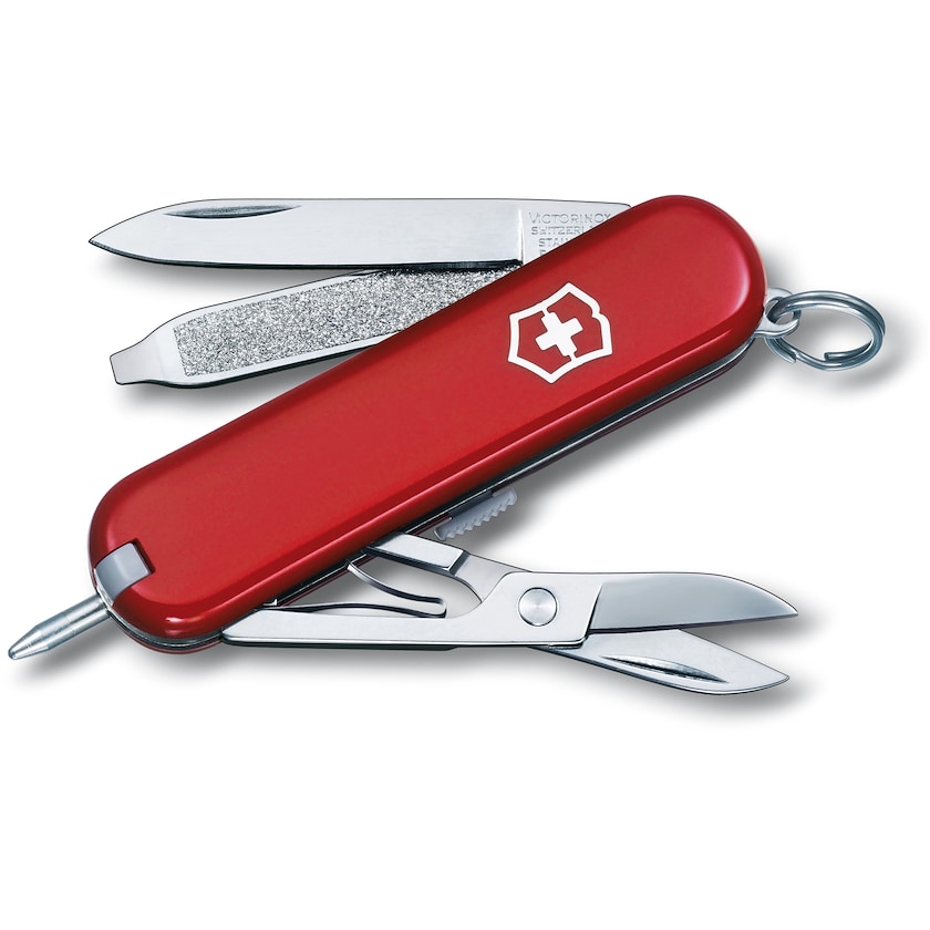 Fiksu linkkuveitsi, jossa kuulakärkikynä. Victorinox Signature -linkkuveitsessä on samat toiminnot kuin mallissa Classic, mutta tässä mallissa kynsiviila korvataan kuulakärkikynällä. Lisäksi mm. veitsi, sakset ja pinsetit.